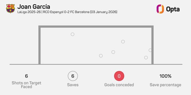 西甲第18輪,巴塞羅那客場2-0擊敗西班牙人,霍安-加西亞完成6次撲救,成為自2023年11月以來,首位在西甲零封比賽中6次撲救的巴薩門將。
