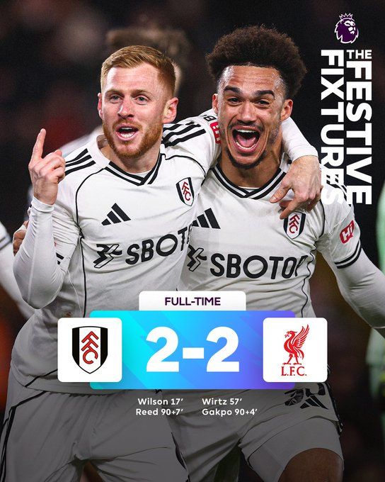 北京時(shí)間1月4日23:15,富勒姆在主場迎戰(zhàn)利物浦。上半場,加克波錯失單刀,哈里·威爾遜低射破門。下半場,麥卡利斯特頭球擊中橫梁,維爾茨扳平比分,威爾遜吊射中框,加克波補(bǔ)時(shí)破門,里德替補(bǔ)登場轟進(jìn)世界波讀秒絕平。最終富勒姆2-2利物浦。本場比賽過后,利物浦積34分依舊排在聯(lián)賽第四,富勒姆積28分排在聯(lián)賽第十一。