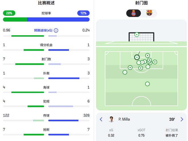 從上半場統計數據看,西班牙人的預期進球高達0.96,巴薩僅有0.24。西班牙人沒能收獲進球,完全是因為喬安加西亞的神撲。
