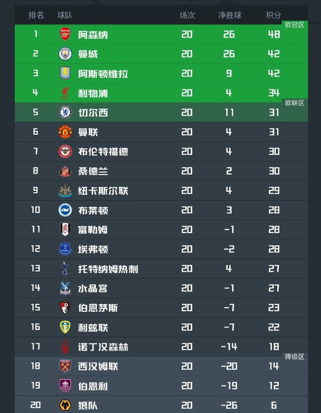 曼城原本各項賽事拿下8連勝士氣正佳,也是給予了阿森納不小的壓力;只是這2輪曼城先是與桑德蘭戰平;這一輪在領先大半場的情況下,傷停補時階段最后時刻被恩佐門前2連擊實現絕平,到手的3分變成了1分,奪冠難度也進而加大。維拉則是被阿森納終結11連勝后,這一輪戰勝諾丁漢森林,與曼城都是同積42分。