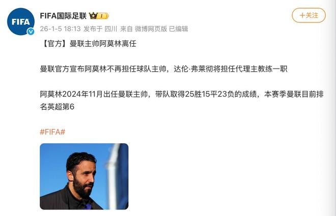 1月5日,據(jù)@FIFA國際足聯(lián) :曼聯(lián)主帥阿莫林離任。阿莫林于2024年11月出任曼聯(lián)主帥,帶隊取得25勝15平23負的成績,本賽季曼聯(lián)目前排名英超第6。據(jù)統(tǒng)計,阿莫林帶隊一年勝率不足40%。