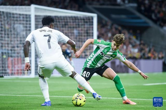 1月4日,皇家馬德里隊球員維尼修斯(左)和皇家貝蒂斯隊球員安赫爾·奧爾帝斯在比賽中拼搶。新華社發(古斯塔沃·巴連特攝)