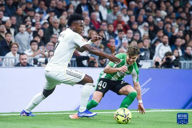 1月4日,皇家馬德里隊球員維尼修斯(左)和皇家貝蒂斯隊球員安赫爾·奧爾帝斯拼搶。新華社發(古斯塔沃·巴連特攝)