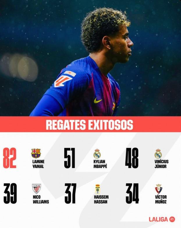 北京時間1月7日,西甲官方曬本賽季成功過人榜:亞馬爾高居榜首,姆巴佩位居次席。