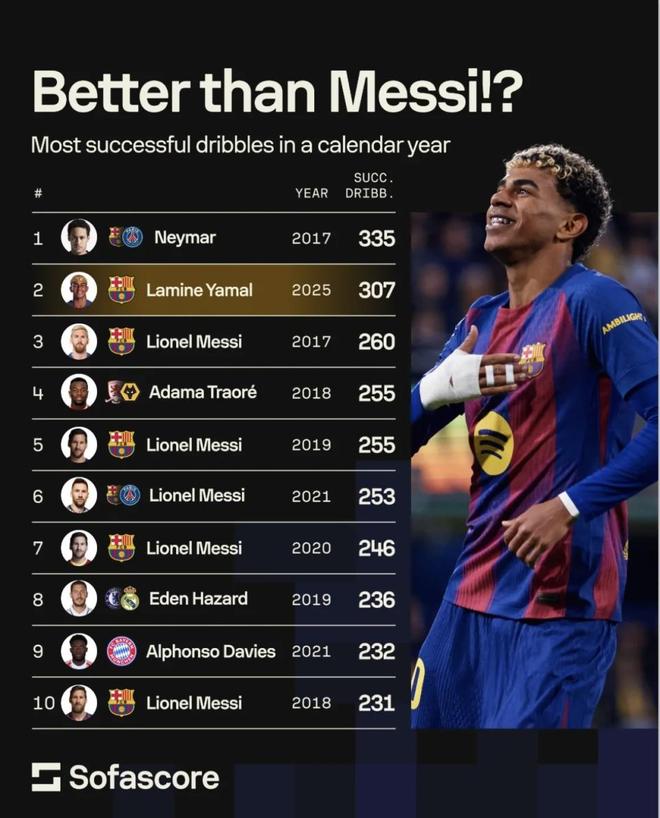 放到亞馬爾身上,2025年這一條307次非??鋸垺粌H直接壓過梅西在榜單上的任何一年(最高260),還幾乎追到內馬爾2017年的335。問題在于,未來想“超過梅西”,關鍵不是再來一次300+,而是能不能連續很多年都保持在250+附近。隨著年齡增長、位置和任務變化(更多組織、更多終結、被重點盯防更狠),過人次數很容易從“高頻硬解”變成“更省著用”。所以更現實的預測是:亞馬爾很有機會在單自然年過人次數上多次超過梅西,甚至沖擊榜單第1;但要在“長期反復上榜、持續多年高產”這一點上真正壓過梅西,難度更大,得看健康、出勤和角色能否長期穩定。