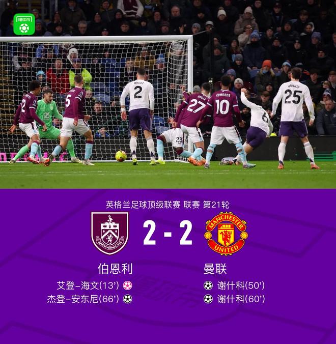 北京時間1月8日4:15,英超第21輪焦點戰,曼聯作客摩亞球場挑戰伯恩利,本場主裁判為阿特維爾。上半場,漢弗萊斯傳中打在海文腳上變線入網。下半場,謝什科先后接B費和多古的助攻破門上演梅開二度,杰登-安東尼兜射救主。最終,曼聯客場2-2伯恩利,遭三連平。