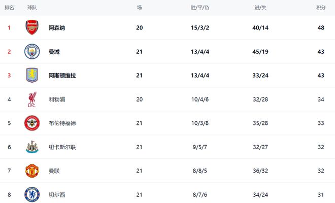 在積分榜上,曼聯和阿斯頓維拉紛紛丟分,讓阿森納賺大了。阿森納總積分是48分。曼城和阿斯頓維拉都是43分。阿森納領先5分,而且還是少賽一場。如果阿森納接下來能夠擊敗利物浦,將把優勢擴大到8分。利物浦目前34分,排名第4。布倫特福德以33分排名第5。紐卡斯爾聯和曼聯都是32分。