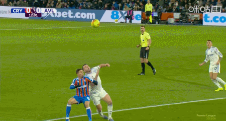 第12分鐘,維拉球員舉手示意米切爾手球,裁判并無表示