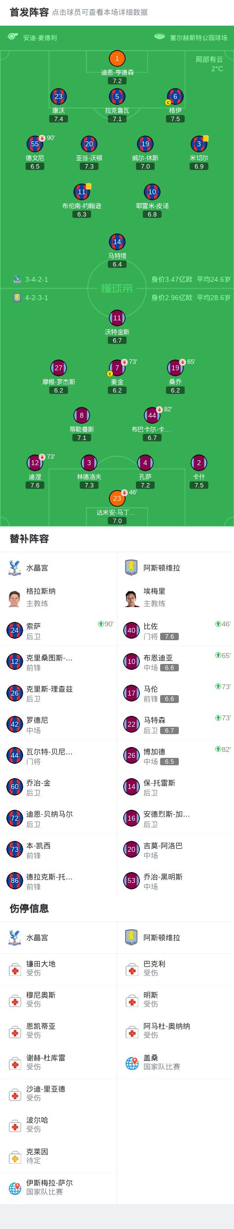 北京時間1月8日英格蘭足球頂級聯賽 聯賽 第21輪,水晶宮主場對陣阿斯頓維拉。最終比分水晶宮 0-0 阿斯頓維拉。