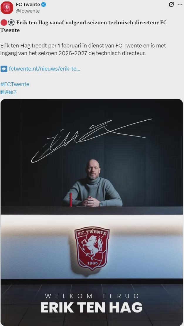 官方:前曼聯主帥滕哈格被任命為了特溫特隊的技術總監。