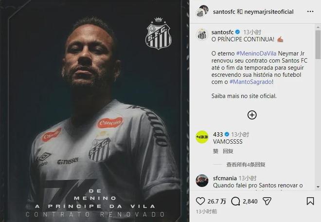 官方:桑托斯宣布和內馬爾續約到賽季結束(12月底)。