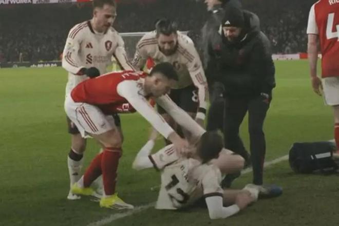 據(jù)現(xiàn)場細(xì)節(jié)顯示,布拉德利在成功避開一次險情后,試圖將球踢向安全區(qū)域,卻在完成動作后失去平衡,膝蓋以尷尬的角度著地,隨后痛苦倒地?zé)o法起身。當(dāng)布拉德利倒地接受治療時,場上出現(xiàn)了爭議一幕:阿森納替補(bǔ)出場的馬丁內(nèi)利將球扔向倒地的布拉德利,隨后站在其身旁。被現(xiàn)場解讀為“試圖將他推下球場,以讓比賽繼續(xù)”。這一行為立即引發(fā)了利物浦球員的強(qiáng)烈不滿,雙方球員迅速聚集對峙,場面一度緊張。