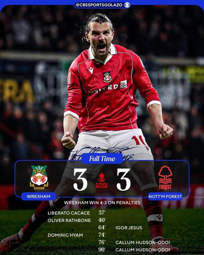 在北京時間1月10日結束的足總杯第3輪一場焦點戰中,英冠球隊雷克瑟姆在主場爆出大冷門,他們在120分鐘內3-3戰平英超勁旅諾丁漢森林,隨后在點球大戰4-3取勝,總比分7-6淘汰對手,晉級下一輪。