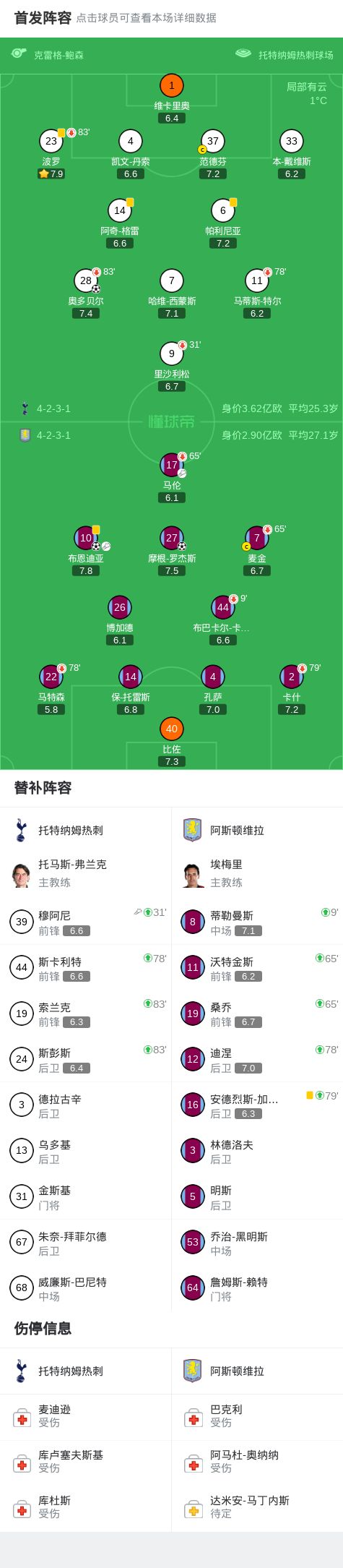 第54分鐘,穆阿尼搶回球權后送助攻,奧多貝爾破門,熱刺1-2維拉