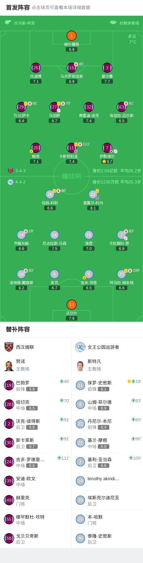 北京時間1月11日英格蘭足總杯 第三輪,西漢姆聯對陣女王公園巡游者。上半場補時階段馬加薩助攻薩默維爾破門。下半場卡拉莫科-登貝萊傳中,里夏爾-科內頭球破門。加時賽薩默維爾過人后傳中,卡斯特利亞諾斯頭球破門。最終西漢姆聯2-1戰勝女王公園巡游者晉級。