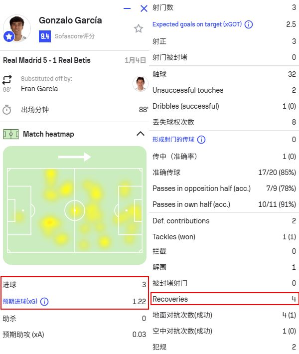 尤其是貢薩洛在西甲對戰聯賽第6名球隊貝蒂斯的時候(在伯納烏擊敗皇馬的塞爾塔是第7),上演了帽子戲法。