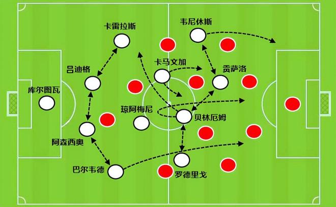 當貝林厄姆回到前腰位置,他跟貢薩洛不斷壓迫馬競的中路出球點,使得馬競只能把球向兩側分,結果卡雷拉斯和巴爾韋德都具備身體優勢,奠定了勝利的基礎。
