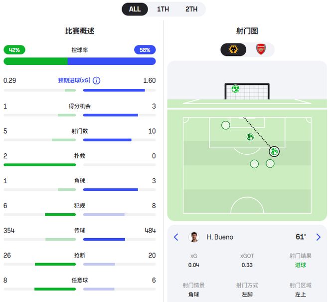 其實狼隊全場比賽也僅有5次射門,第一腳射門更是出現在上半場的補時階段。結果他們最后2腳射門都進球了,更不可思議的是,61分鐘的那個進球,預期進球僅有0.04。