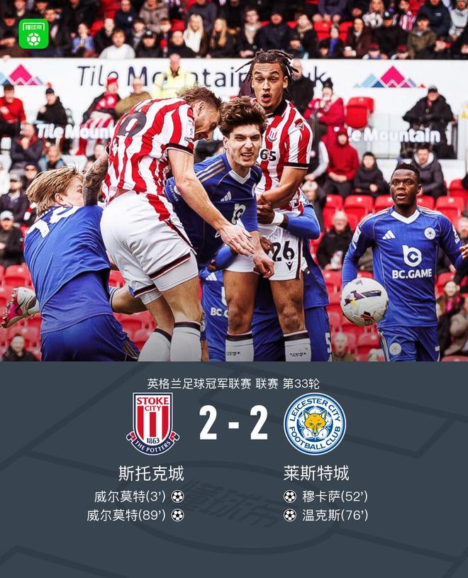 北京時(shí)間2月21日英格蘭足球冠軍聯(lián)賽 聯(lián)賽 第33輪,斯托克城主場(chǎng)對(duì)陣萊斯特城。斯托克城威爾莫特梅開二度。萊斯特城穆卡薩破門,溫克斯建功。最終比分斯托克城 2-2 萊斯特城。萊斯特城遭遇7輪不勝,仍然位居英冠降級(jí)區(qū)。